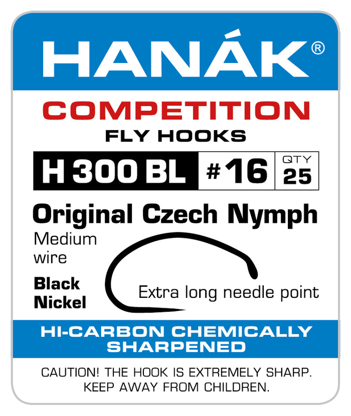 Hanak competition hooks are the result of long-term development in cooperation with leading competition flyfishermen. Exceptional shape, needle tip and the use of high-carbon steel to increase success. All are barbless with a special elongated needle point.