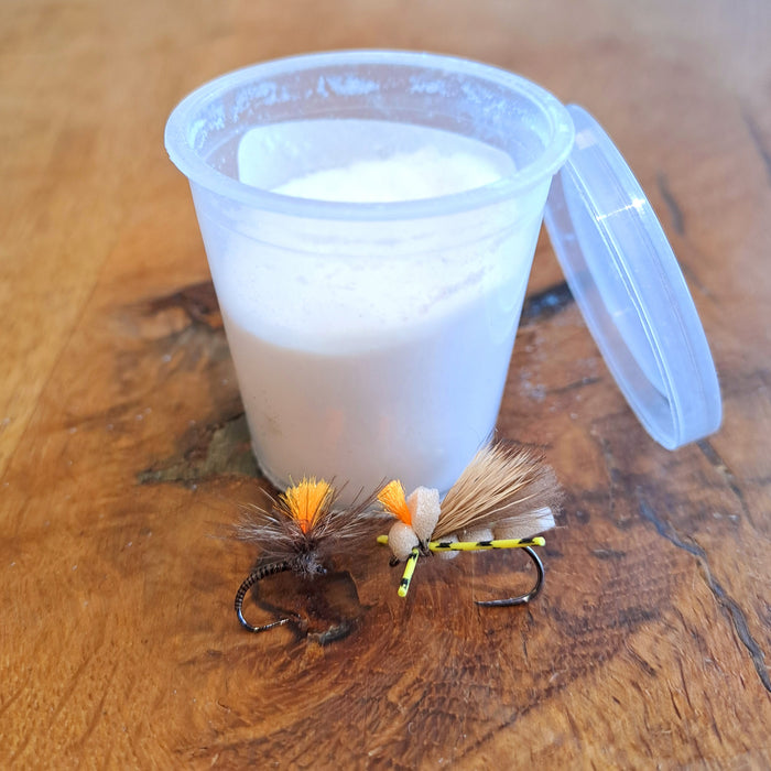 Powder dessicant top up for floatant systems such as Loon Top Ride. The powder will quickly absorb the water from the fly, and the fly will be dry in a matter of minutes.