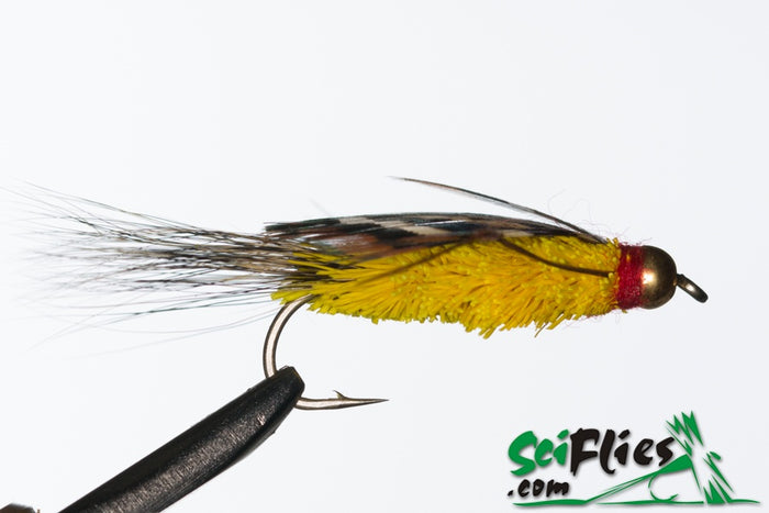Gold Brass bead weight with coloured collar3 flies per packTied on barbless Grip streamer hook